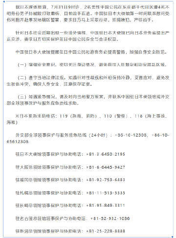 据日本媒体报道,在7月31日的9:00左右,两名中国公民在东京奇亚达(Chiyoda)地区的四名身份不明的男子严重受伤,在那里他们被武器殴打并严重受伤。...