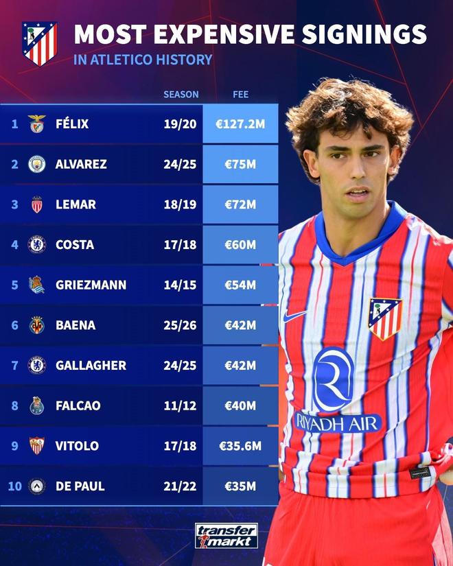据《世界体育报》此前报道,阿波罗体育资本将以约13亿欧元收购马德里竞技俱乐部55%的股份,成为马德里竞技的主要股东。此前,德国转会市场列出了马竞历史上最昂贵的引援,菲利克斯以1.272亿欧元位居榜首。马竞史上最贵引援纪录1.加拉格尔24/25赛季4200万欧元8、法尔考11/12赛季4000万欧元9、维托洛17/18赛季3560万欧元10、德保罗21/22赛季3500万欧元