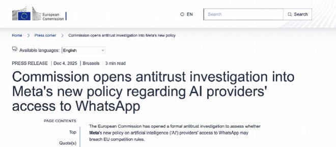 又一起涉及人工智能的反垄断案件浮出水面。 12月4日,欧盟委员会宣布对Meta启动正式反垄断调查,以评估针对WhatsApp人工智能功能的新政策是否涉嫌损害市场竞争。欧盟委员会已宣布对 Meta 展开反垄断调查。今年10月,WhatsApp更新了商业API政策,新增“AI提供商”章节,并明确禁止AI模型厂商在WhatsApp上分发AI助手服务。该规定将于 2026 年 1 月 15 日生效。具体来说,该规定规定,严格禁止人工智能或机器学习技术的提供商和开发商直接或间接访问或使用 WhatsApp 的商业解决方案以提供、交付、要约销售或以其他方式提供此类技术。 WhatsApp“AI 提供商”规定。这些人工智能提供商包括但不限于大型语言模型、生成式人工智能平台、通用人工智能助手以及 Meta 自行确定的类似技术;它们针对的是这些技术的主要功能——即企业仍然可以使用助动词或支持 WhatsApp 中的其他 AI 工具。尽管存在上述限制,Meta 指出,用户可以根据 WhatsApp 商业解决方案的条款,使用 AI 提供商作为第三方服务提供商,只要这种行为不会导致商业解决方案数据被用于创建、开发、操纵或改进任何其他 AI 模型。 Meta澄清,如果用户违反上述限制,他们将有权终止其帐户并撤销对WhatsApp商业解决方案的访问权限。欧盟委员会担心这项新政策可能会阻止第三方人工智能提供商通过 WhatsApp 在欧洲经济区提供服务。据欧盟委员会称目前,许多人工智能提供商已经通过 WhatsApp 提供了对其人工智能助手的访问,允许用户直接在应用程序内与人工智能进行交互,以完成诸如回答问题、生成内容或访问客户支持等任务。但根据这项新政策,欧盟委员会认为 Meta 的竞争对手人工智能提供商可能会被阻止通过 WhatsApp 联系其客户。 Meta自有的人工智能服务“Meta AI”将继续向平台上的用户开放。欧盟委员会负责反垄断事务的执行副主席特雷莎·里贝拉表示,随着人工智能的蓬勃发展,有必要确保欧洲公民和企业能够充分受益于这场技术革命,并采取行动防止占主导地位的数字巨头滥用市场力量、抄袭创新竞争对手。 “因此,我们正在调查Meta的新政策是否可能违反竞争规则,并评估是否立即采取措施特蕾莎·里维拉表示,欧盟委员会还指出,此次正式调查将覆盖除意大利以外的欧洲经济区(EEA),这是为了避免意大利城市市场的冲突与竞争局正在进行的诉讼重叠,该局考虑针对 Meta 的行为采取临时措施。据南都反垄断前沿报道,今年 7 月 30 日,意大利竞争与市场管理局(AGCM)宣布对意大利竞争与市场管理局(AGCM)展开反垄断调查。 Meta 评估该公司与 WhatsApp 的深度整合是否涉嫌滥用市场支配地位,意大利反垄断监管机构指出,自 2025 年 3 月起,Meta 在未经用户事先同意的情况下在 WhatsApp 服务上预装了 Meta AI,此外,Meta AI 被置于屏幕显着位置并集成到搜索栏中。“诱导”用户使用Meta AI和WhatsApp的服务,不仅会损害竞争对手的利益,还可能导致用户对Meta AI产生“锁定效应”或依赖功能——尤其是随着用户不断提供信息,该服务生成的答案将变得越来越有用和准确。南都反垄断前沿发现,连续两次欧洲反垄断调查涉及Meta的AI布局,表明AI领域的竞争担忧正在引起监管机构的关注。愈演愈烈,科技巨头的AI业务布局将受到特别关注,AI反垄断或有意监管强力介入:南都n视频记者 李凌 北京